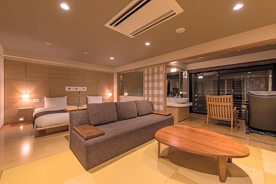 The spacious quadruple room provides air conditioning, a tea and coffee maker, as well as a private bathroom featuring a bath and a shower. The quadruple room features a wardrobe, a safe deposit box, a sofa, yukata and a flat-screen TV. The unit offers 2 beds and 2 futons.